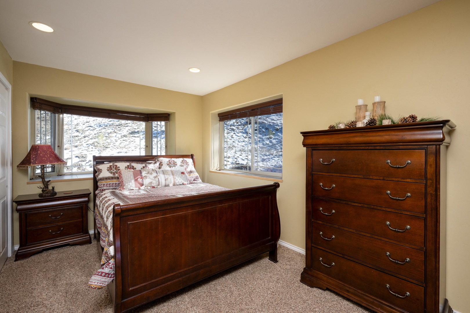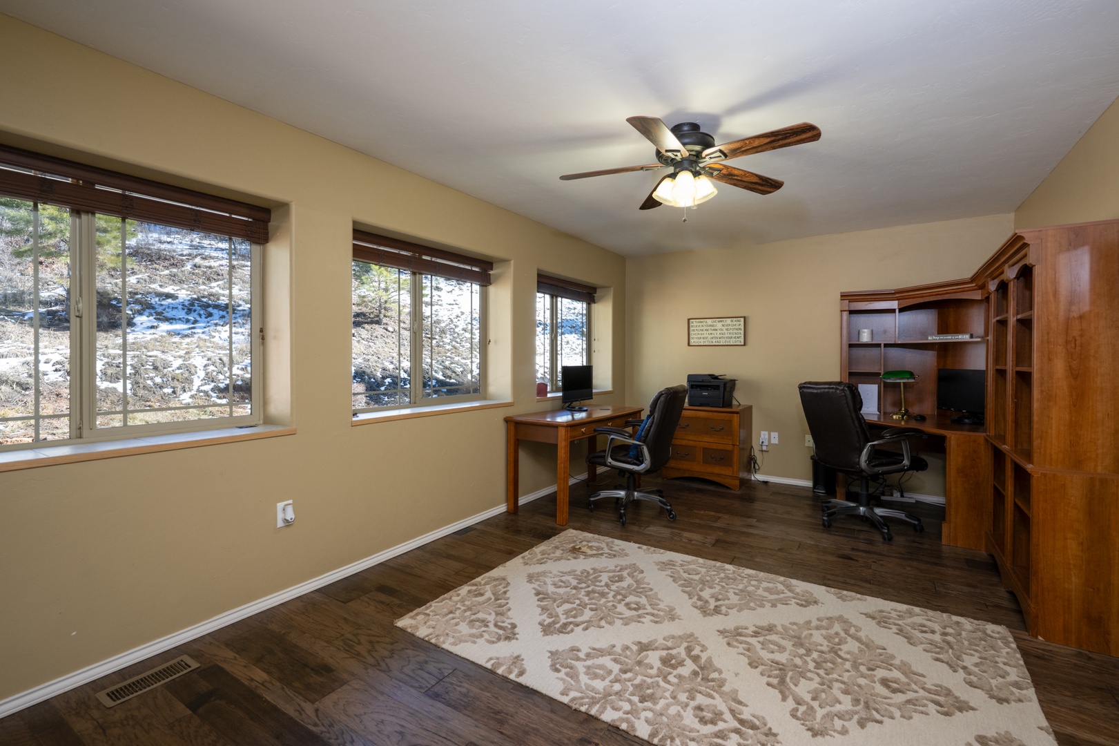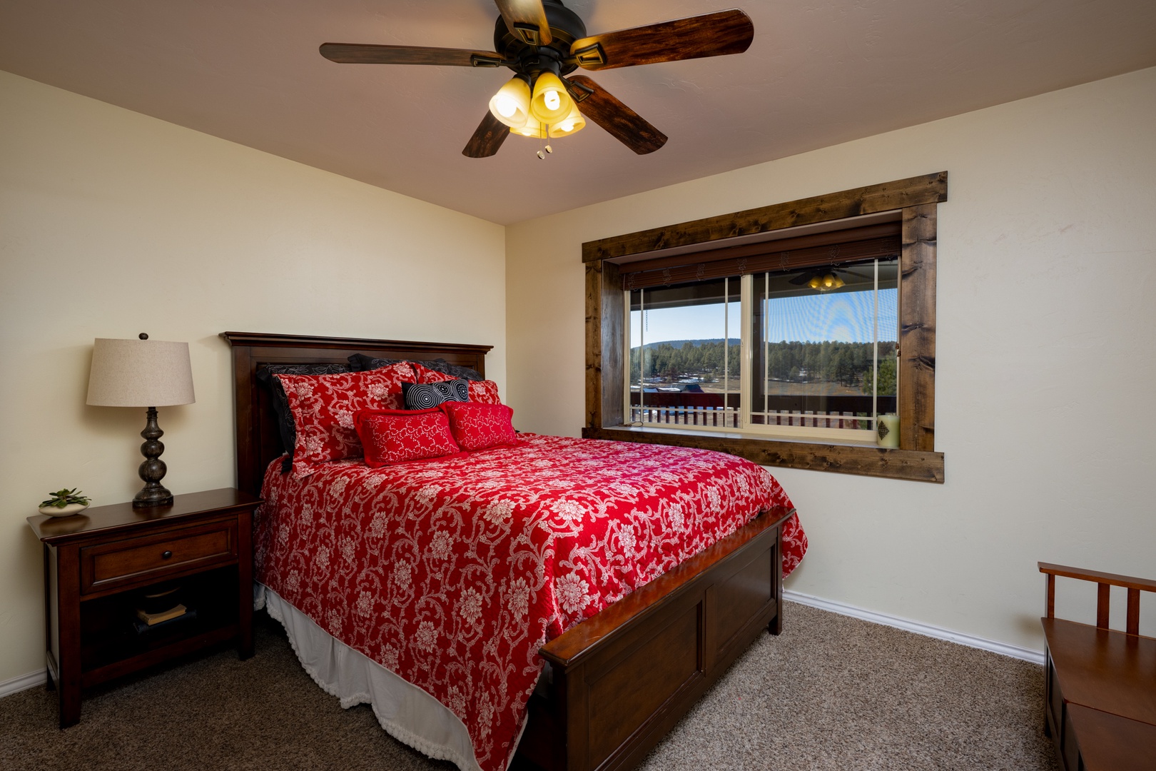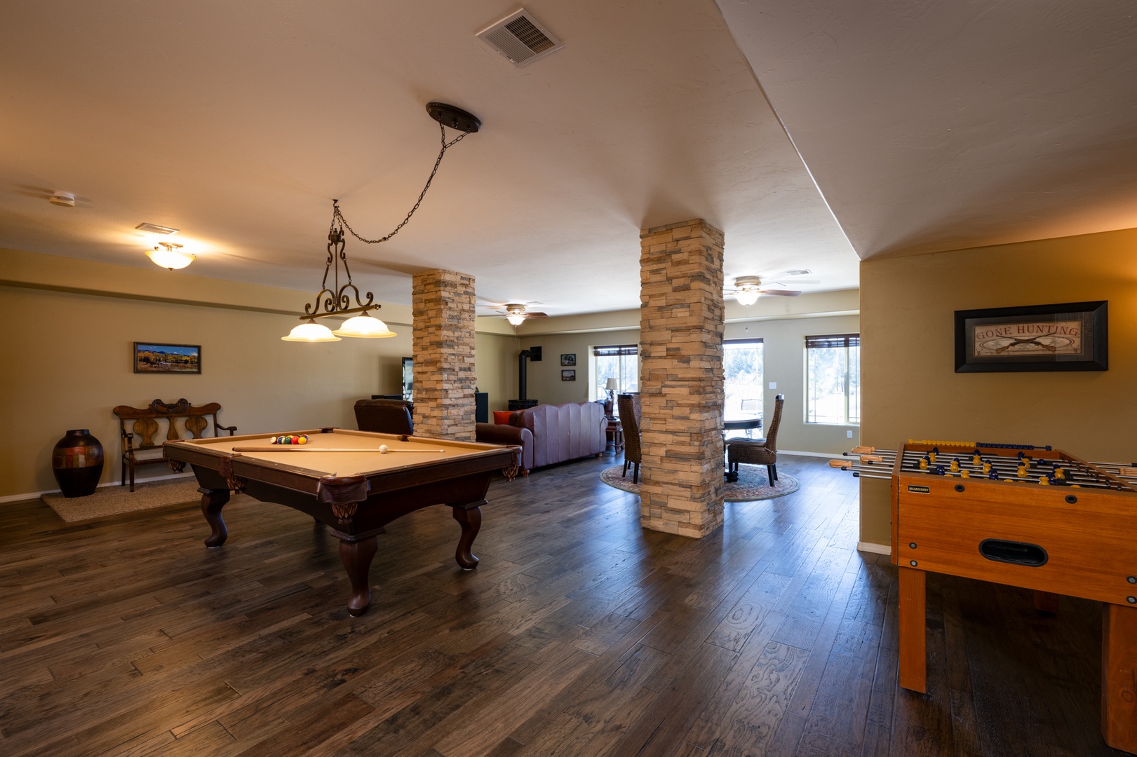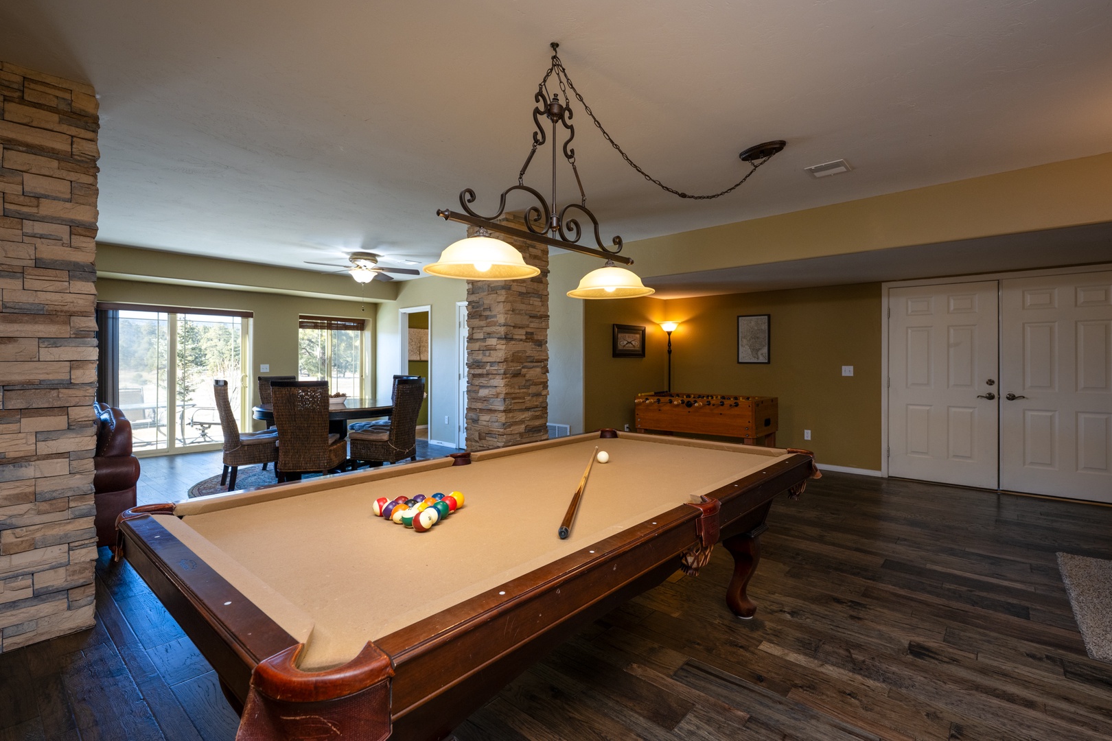 Pagosa Valley Views is a 4 bedroom, 3.5 bathroom two level home located in a private mountain setting surrounded by trees and incredible views of the valley. With a king bed and four queen beds, the home comfortably sleeps 10 and boasts a huge deluxe kitchen and living area, dedicated office,, game room with a pool table and foosball table, 2 large decks with outdoor seating, a gas firepit, large garage, and literally everything you can think of to enjoy a perfect Pagosa Springs vacation!