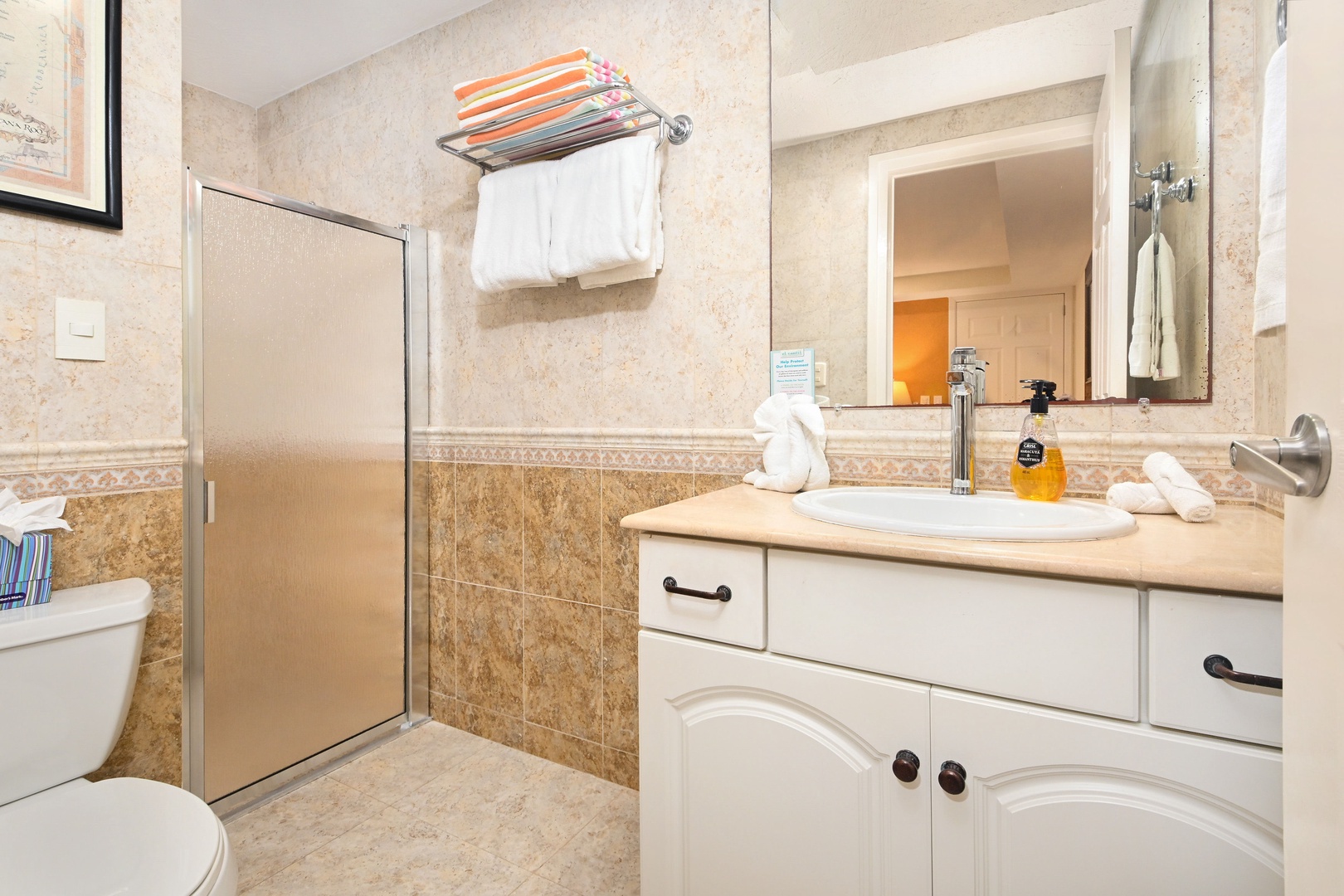 There are two spacious bedrooms, each with a comfortable king bed. The master suite has a flat screen TV and beautiful views of the Caribbean Sea, with access to the private terrace that also connects to the living area. Don't miss the spectacular sunsets over the water! Out on the terrace there's a table for 4 so you can enjoy meals while refreshing sea breezes cool you off. There are also lounge chairs for sun tanning and enjoying the sights. Inside, a full kitchen is totally equipped so that you can create memorable meals should you choose, featuring a brand new fridge, stove, and microwave. There is dining space for 4, and of course everything is laid out to take advantage of the amazing views! A central air conditioning system will keep you comfortable. With a special cable package, you'll find plenty of US channels to watch as you lounge on the plush furniture. Also, there is WiFi and a Vonage phone line for long distance calls. Relax while taking in the breathtaking views of the Caribbean!