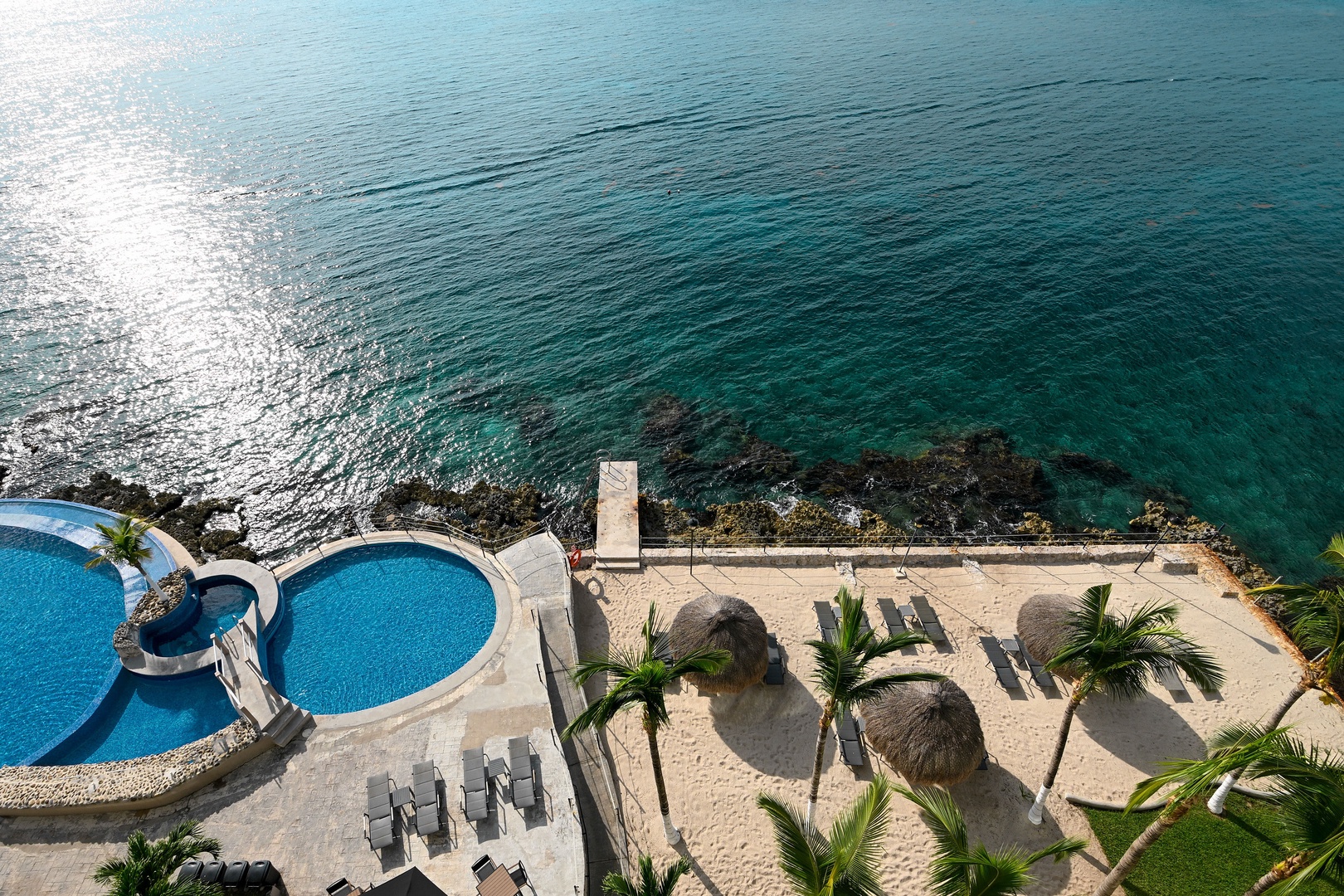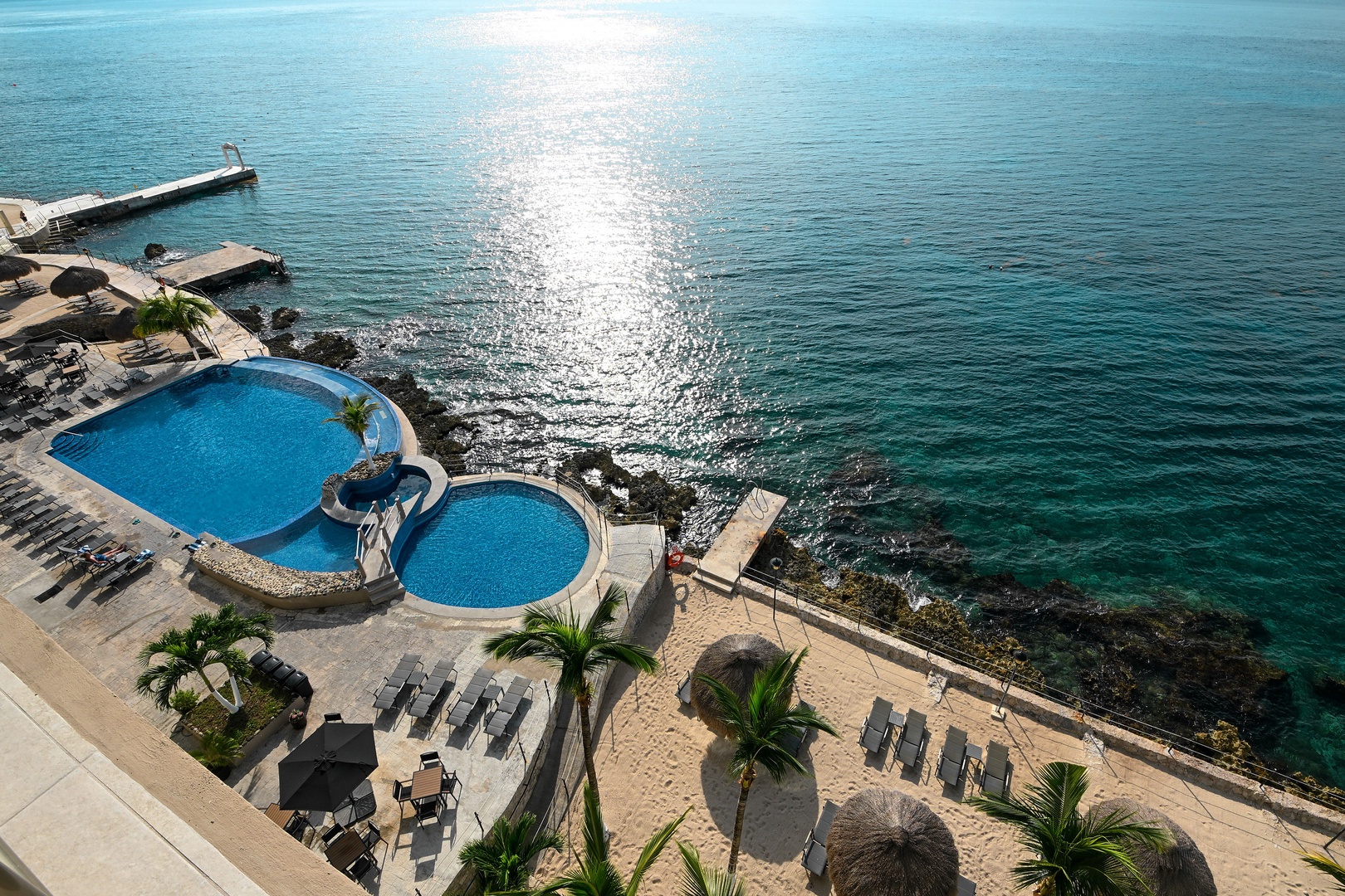 In a great location, this beachfront condo is perfect if you want to be close to town and yet right at the water's edge. With steps leading right into the ocean, you can snorkel the reef to your heart's content. There's also an infinity pool and shallow pool for the kids. El Cantil is literally across the street from a major grocery store and a cinema, and you're only steps away from a shopping center with Starbucks and other cafes and restaurants. The ferry dock is about a 20-minute walk, and taxis are plentiful here. All the dive operators on the Island pick-up and deliver right to your dock.