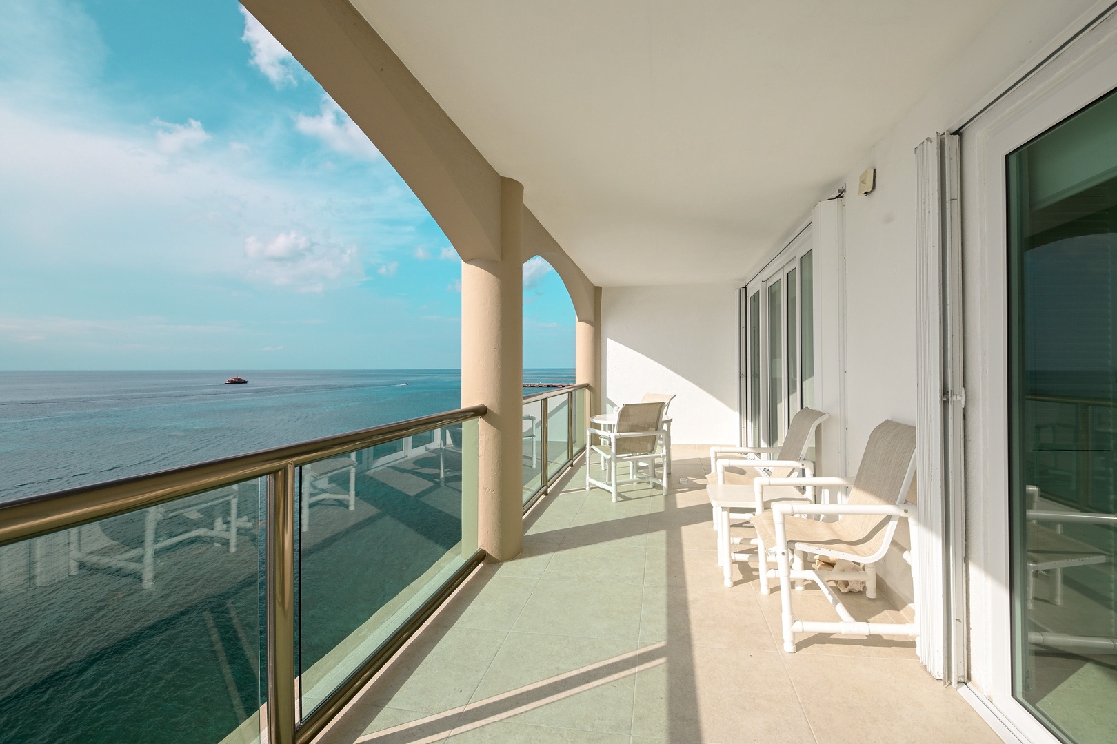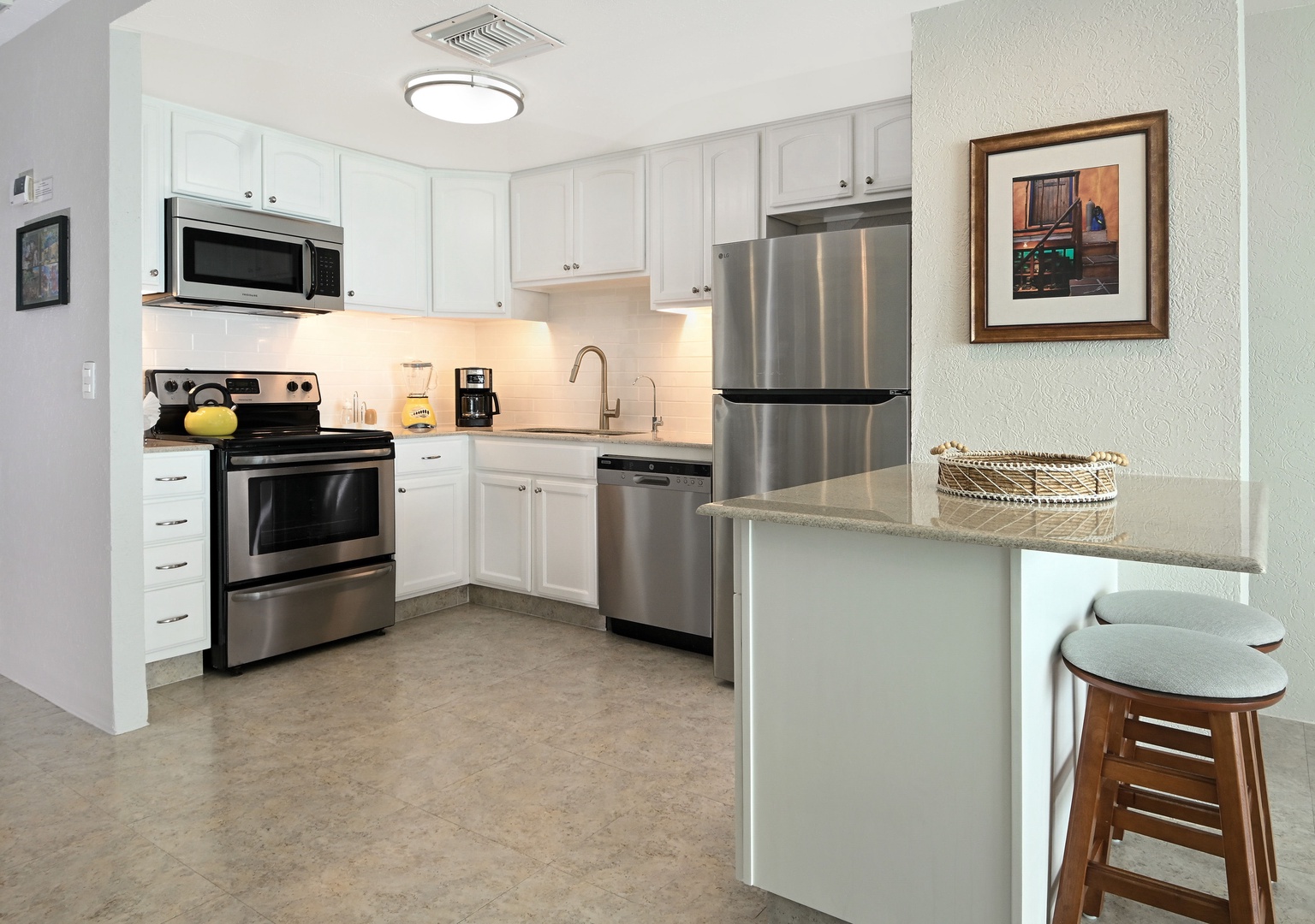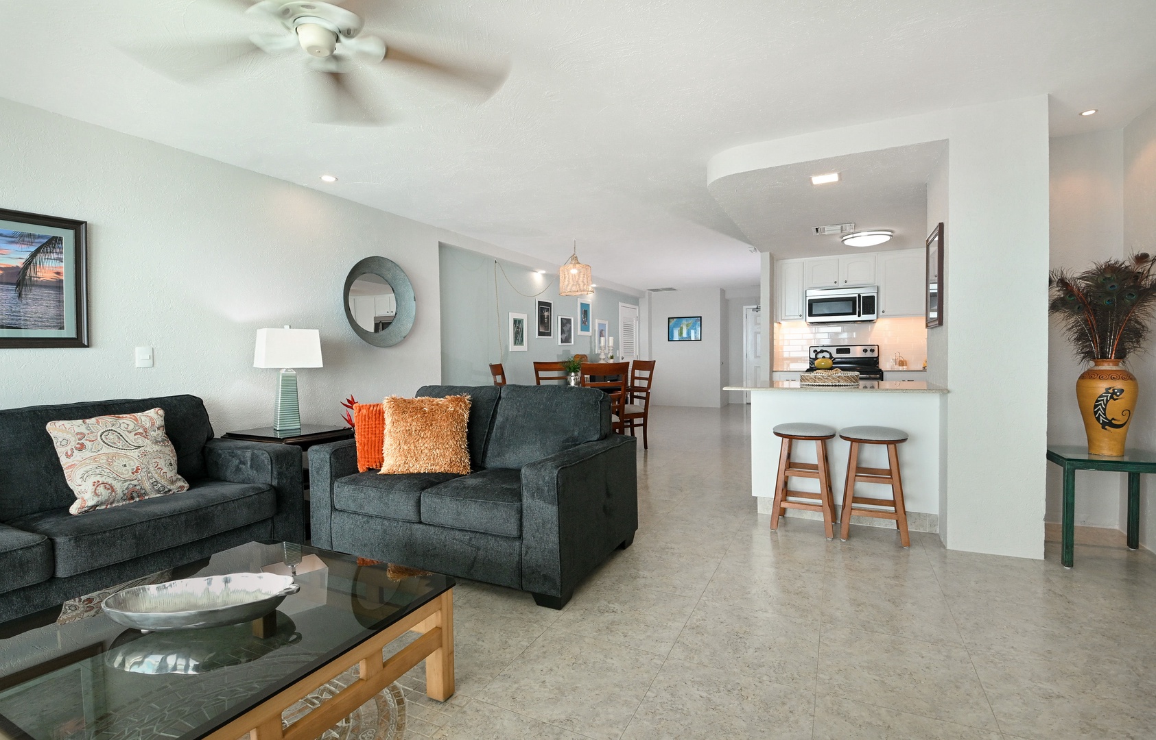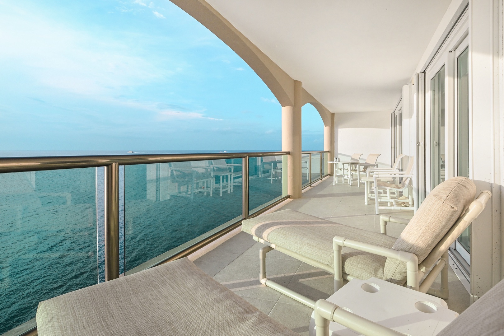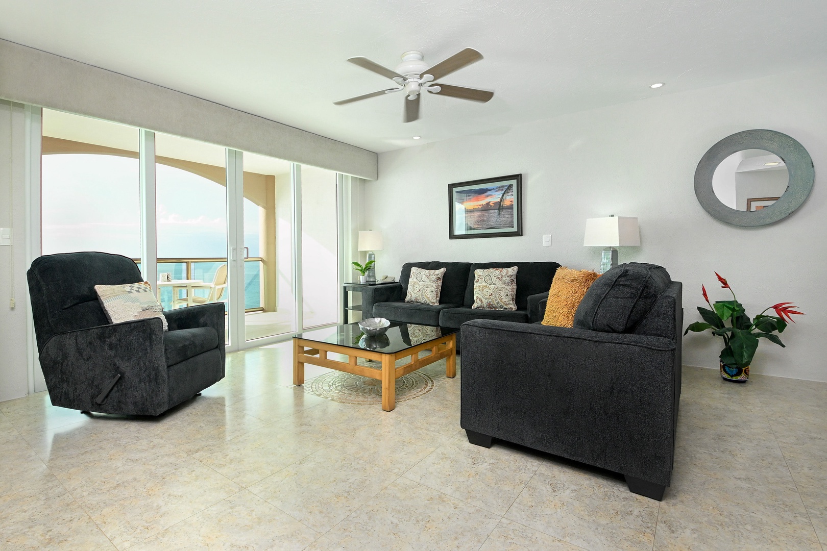 Welcome to your dream vacation retreat! This stunning 7th floor condo boasts a private terrace, perfect for soaking up the sun or enjoying starlit evenings. With two luxurious bedrooms featuring king beds, this stylish getaway sleeps up to four guests comfortably. Each of the two full bathrooms is elegantly appointed, ensuring both convenience and luxury. Step into a world of contemporary Mediterranean style with designer furniture and 300 count linens that promise a restful night's sleep. Stay cool and comfortable with central A/C while staying connected with high-speed internet. The fully equipped kitchen includes top-of-the-line appliances such as a refrigerator, microwave, oven, blender, stove, drip coffee maker, and dishwasher, making meal preparation a breeze. Enjoy Smart TVs with cable- 50" TV in the living room, 40" TV in the first bedroom, and 42" TV in the second bedroom (use your own log ins).