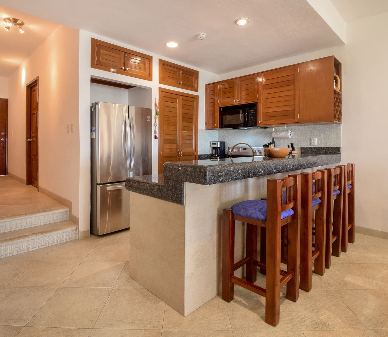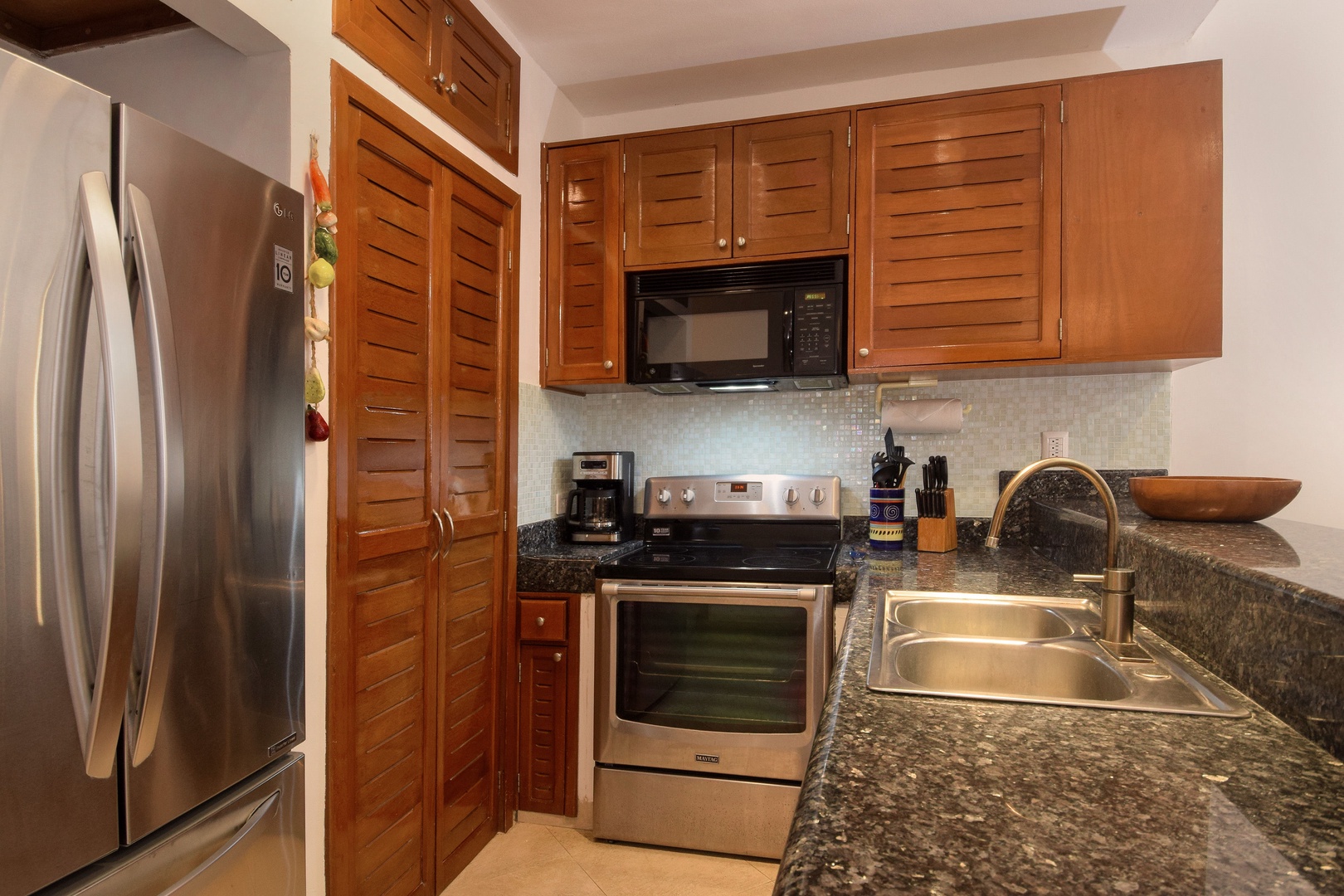 Prepare meals in the fully-equipped kitchen, boasting granite countertops and a cozy bar area for 4. Gather with loved ones in the open dining area for 6, or unwind in the plush suede furniture of the living room, stocked with books and DVDs for your entertainment. Decorated in soothing tones to complement the stunning beach views, this vacation rental promises a serene and unforgettable coastal escape.